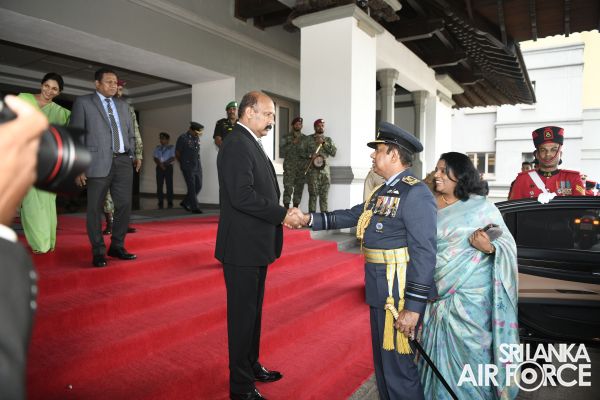 The outgoing Commander of the Air Force, Air Marshal Sudarshana Pathirana with his lady Mrs. Charmini Pathirana, made a farewell call on the Secretary to the Ministry of Defence, General Kamal Gunaratne (Retd) at the Ministry premises yesterday. (28 June 2023).