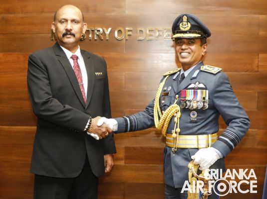 This courtesy call marked the first formal meeting between the Commander and the Secretary since Air Marshal Rajapaksa assumed his role as the 19th Commander of the Sri Lanka Air Force. During the ensuing cordial discussion, the Secretary extended his well wishes to Air Marshal Rajapaksa on his new appointment. The Commander presented the Secretary with a commemorative token to mark the occasion.