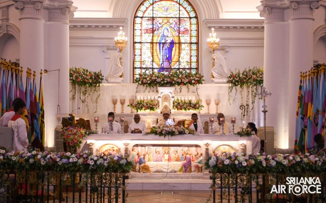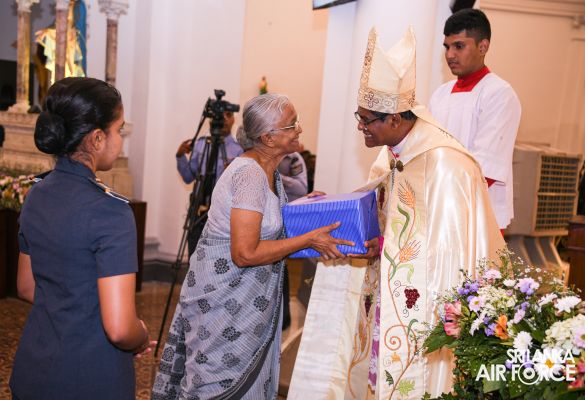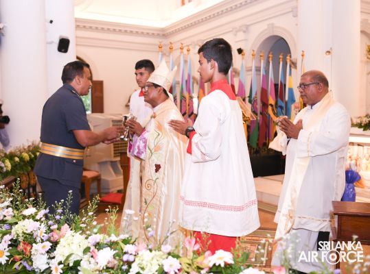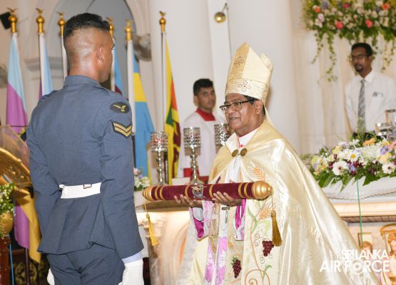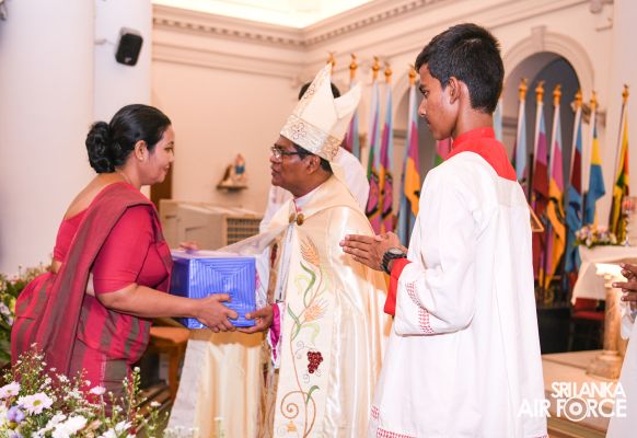 A distinctive feature of the service was the Blessing of the Flags, where flags representing the Air Force Academy, all Bases and Stations of the SLAF were marched up to the Alter and blessings were invoked on them and the establishments that they represented by His Lordship Most Rev. Dr. Maxwell Silva. A scroll containing the names of all who have laid down their lives in the line of duty was also offered and consecrated.