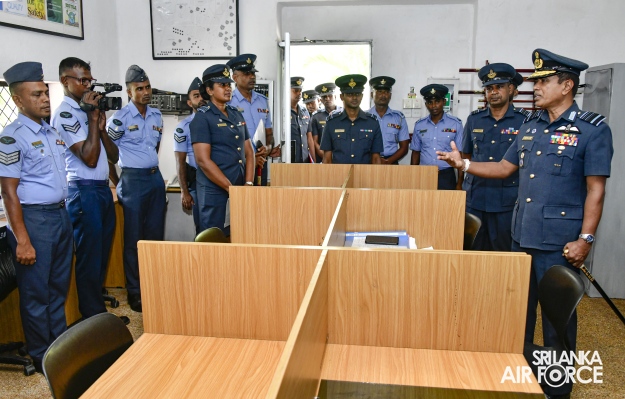 The Commander of the Air Force, Air Marshal Udeni Rajapaksa, visited all areas of the Trade Training School despite adverse weather conditions. Following the inspection, the Commander addressed all ranks of the School including the trainees and civilian personnel. During the address, he emphasized the pivotal role of Trade Training School Ekala as the forerunner of SLAF trade training and he focused on the requirement of developing the infrastructure at the school.