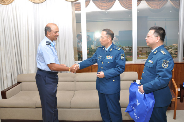 The Chief of Staff of the Chengdu Regional Air Command of China, Major General Ding Laihang paid a courtesy call on the Commander of the Air Force Air Marshal Harsha Abeywickrema this morning. Major General Ding Liahang was accompanied by Senior Colonel Jiang Lisheng, Colonel Xu Kan and Mr Han Tao - the Charge d' affairs of the Embassy of China.