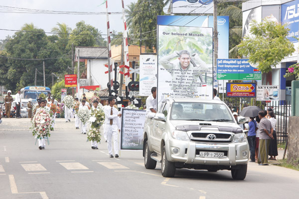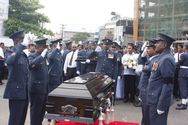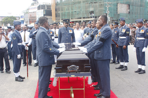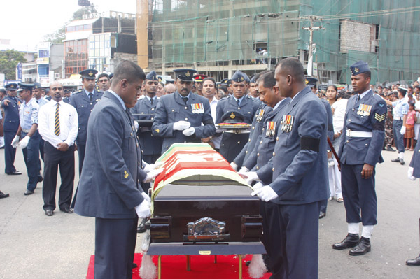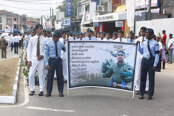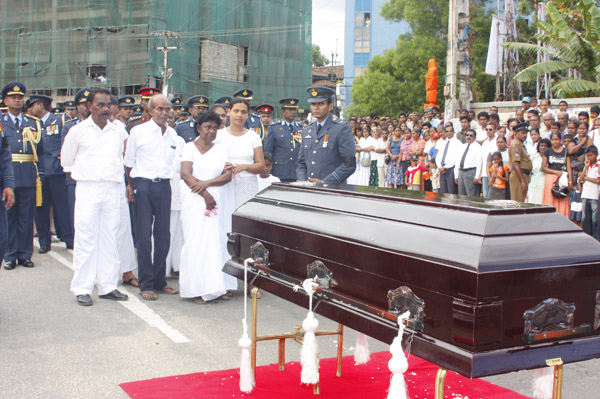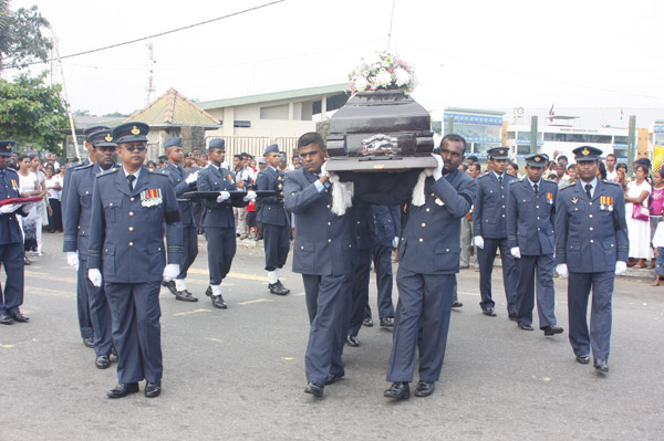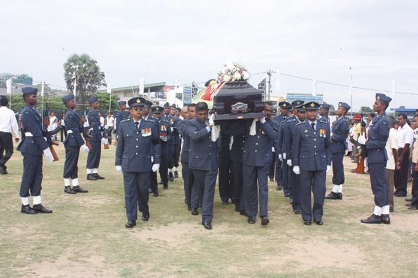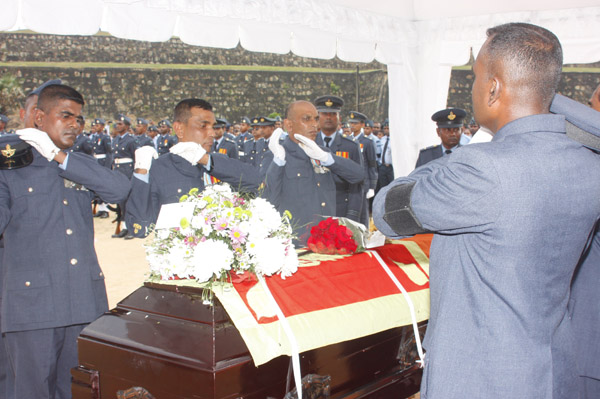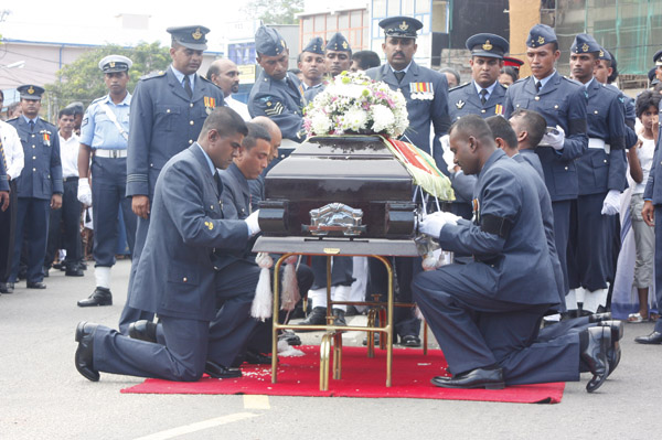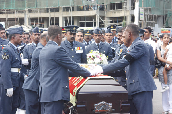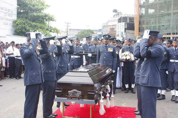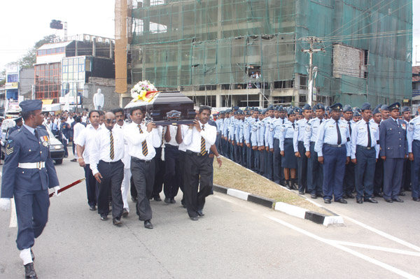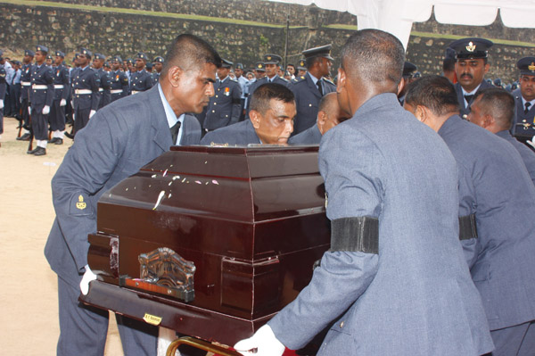 The cortege left the late pilot’s residence at Kitulampitiya Road and was handed over to the Sri Lanka Air Force near the Galle Public Library at 3pm. The mortal remains of Squadron Leader Monath Perera was cremated with full Air Force honours at the Samanala grounds in Galle.