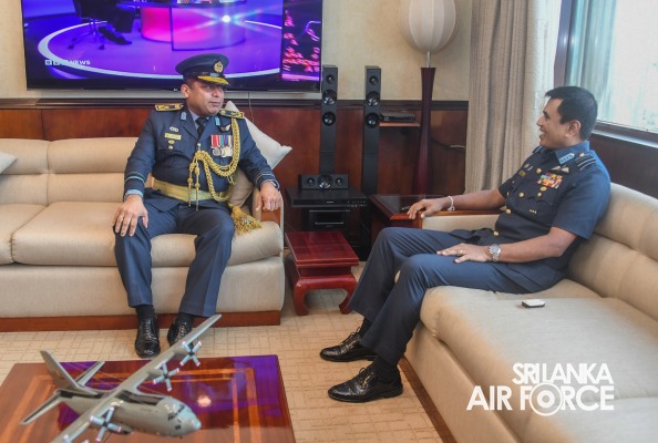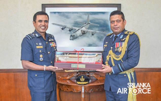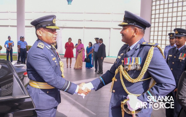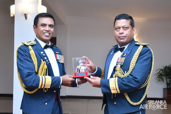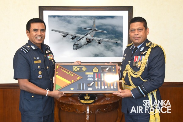Air Vice Marshal Senanayake made an official farewell call on the Commander of the Air Force, Air Marshal Udeni Rajapaksa, at his office today. The Commander commended him for his dedicated service rendered to the nation and to the Sri Lanka Air Force in particular. The Commander also emphasized that he was one of the key stakeholders during times of need for our motherland and that his heroic history will remain etched in the annals of the SLAF. The Commander and Air Vice Marshal Senanayake exchanged mementos to mark the occasion. Afterwards, he was accorded a Ceremonial Guard of Honour by the SLAF Colour Wing before departing from Air Force Headquarters for the last time.