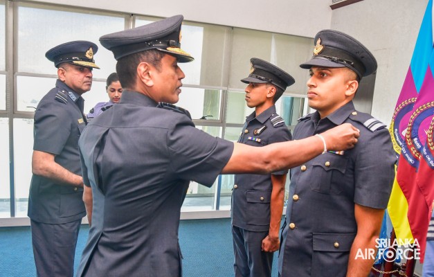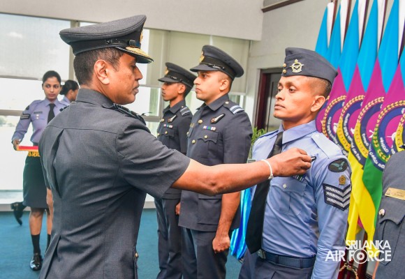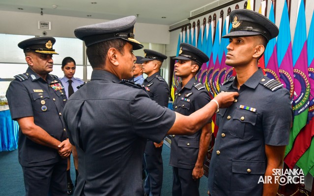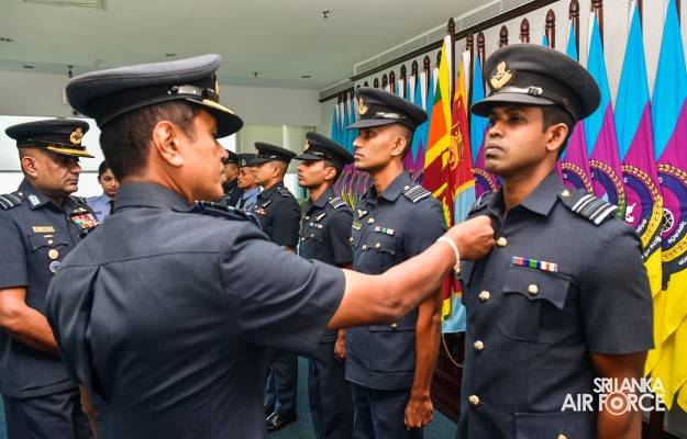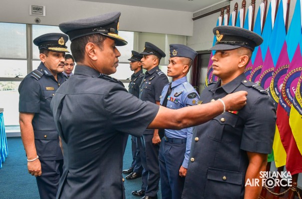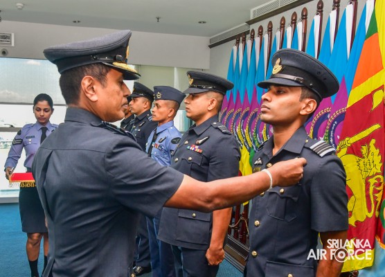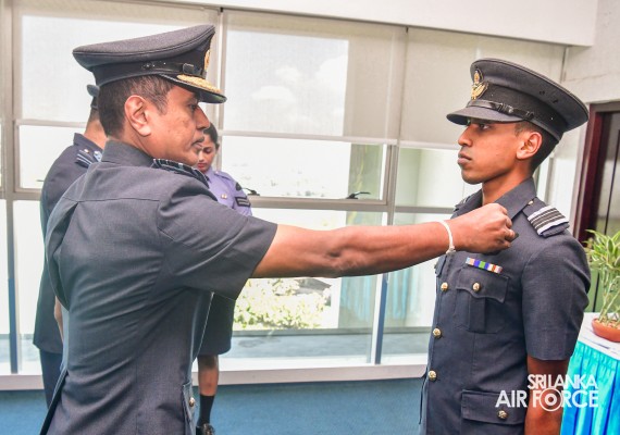 The Awarding Ceremony of Air Crew Qualification Insignia was held today (06 November 2023) at Air Force Headquarters, where the Commander of the Air Force, Air Marshal Udeni Rajapaksa, graced the event as the chief guest. Accordingly, Flight Engineer, Load Master, Air Surveillance Brevets and Fighter Controllers' Badges were awarded to the individuals who qualified for the respective training courses.