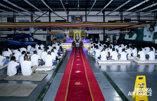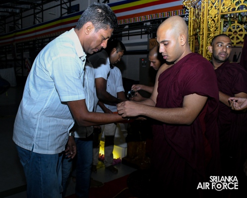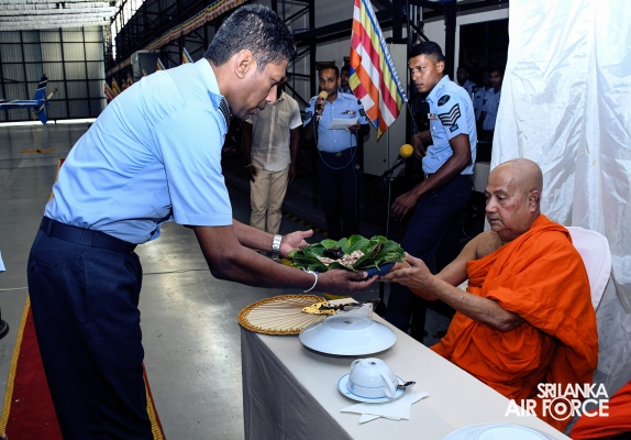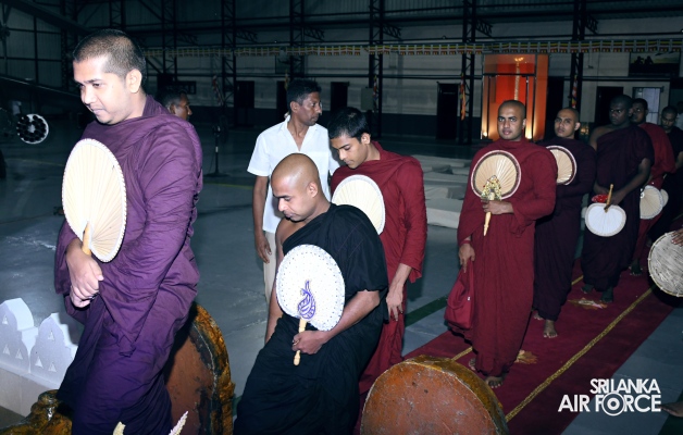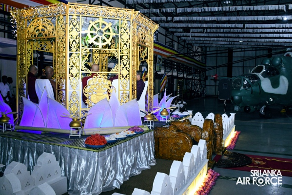 The pirith chanting ceremony was attended by the Acting Base Commander, Group Captain Milinda Mendis, all officers and other rank members of the SLAF Base Hingurakgoda. The ‘reliquary’ (Karaduwa) was brought to No.9 Attack Helicopter Squadron hangar premises in a vivid procession and was placed in the ‘Pirith Mandapaya’ by the Commanding Officer No.9 Attack Helicopter Squadron, Wing Commander Sampath Liyanarachchi.