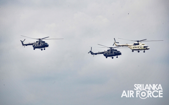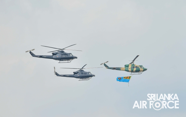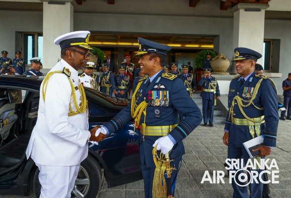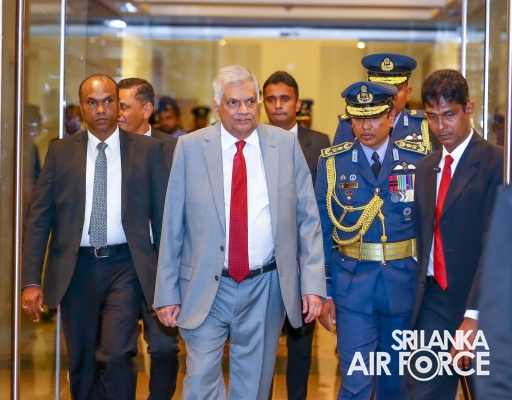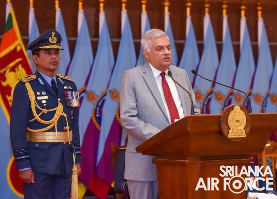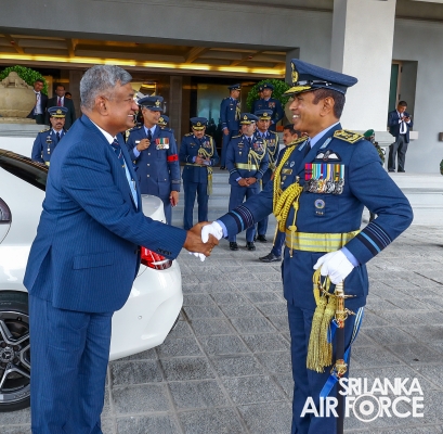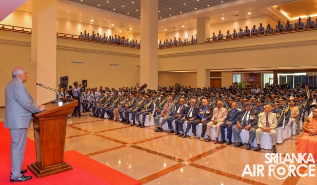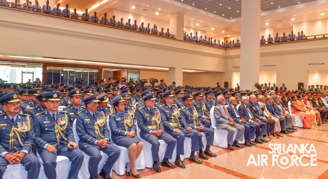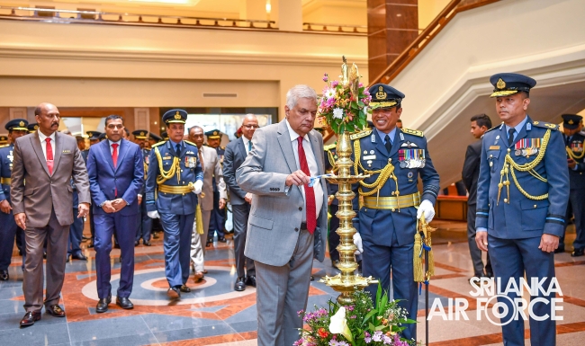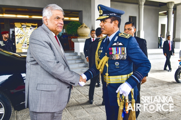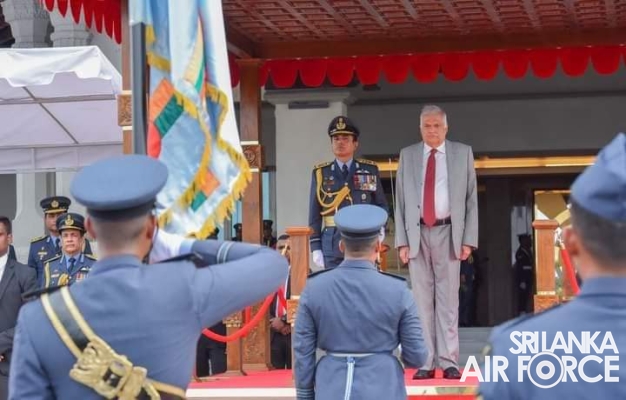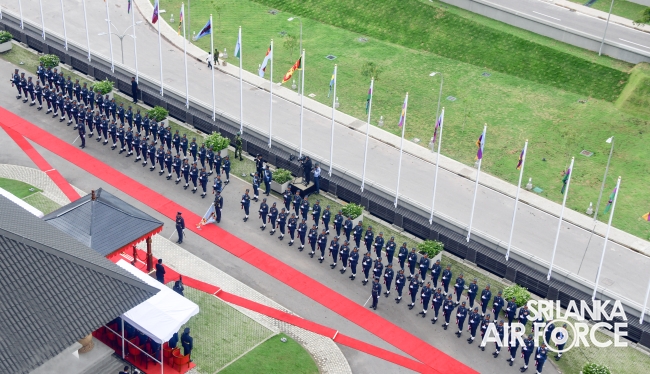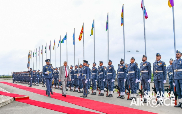 The distinguished Chief Guest, Hon. Ranil Wickremasinghe, was warmly welcomed by the Commander of the Air Force, Air Marshal Udeni Rajapaksa and accorded a ceremonial Guard of Honour. Simultaneously, a dignified aerial tribute was offered by one Bell 212, two Bell 412s, three MI-17s, three Y-12s, one AN-32B and one F-7 aircraft of the Air Force in honour of the President. The event was attended by Marshal of the Air Force Roshan Goonathilake, State Minister of Defence, Hon. Premitha Bandara Tennakoon, National Security Advisor ,Hon. Sagala Ratnayake, Secretary to the Ministry of Defence, General Kamal Guneratne (Retd), Chief of Defence Staff, Former Commanders of the SLAF, Commanders of the Army and Navy, Chief of Staff of the SLAF, Deputy Chief of Staff, Members of the Air Force Board of Management, Senior Officers from Tri services, other State Officials and all the other ranks.