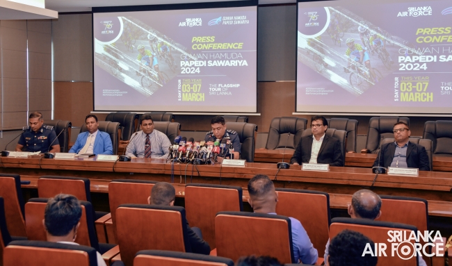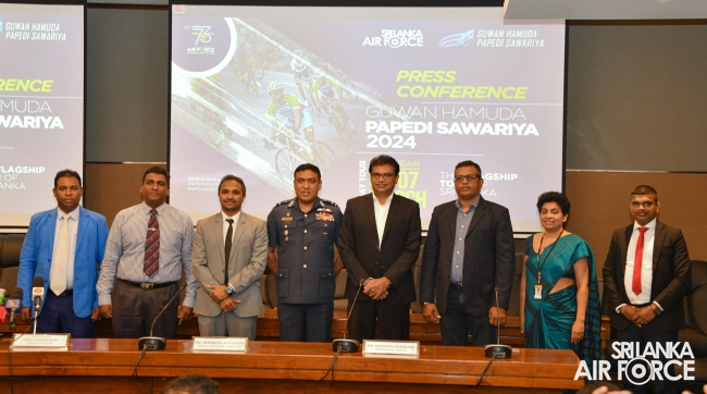 The press briefing on "Guwan Hamuda Papedi Sawariya 2024” was held today (27 February 2024) at the Air Force Headquarters. This year’s race will be conducted for the 25th consecutive time in concurrence with the 73rd Anniversary of the Sri Lanka Air Force. Over two hundred upper-grade cyclists and other cyclists, including Indian Air Force cyclists, are expected to compete in this race. Guwan Hamuda Papedi Sawariya is recognized as one of the premier and most thrilling events in the Sri Lankan Cycling event calendar.