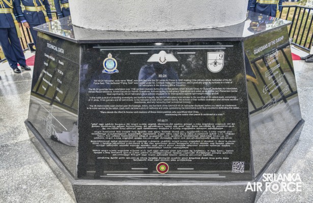 The MI-24, code named 'Hind,' has been honoured with a monument declared open today (02 March 2024), on the route to the Defence Headquarters Sri Jayewardenepura. The ceremony was graced by the presence of the Commander of the Air Force, Air Marshal Udeni Rajapaksa, who inaugurated the monument and paid his respects with a floral tribute. The occasion was attended by the members of the Air Force Board of Management.