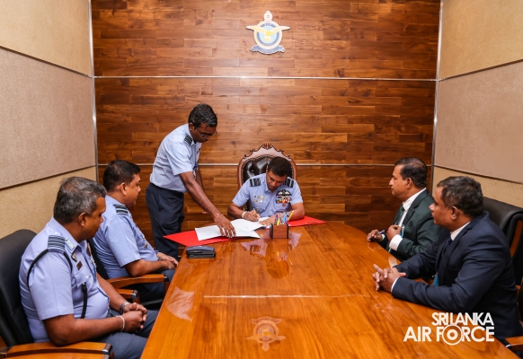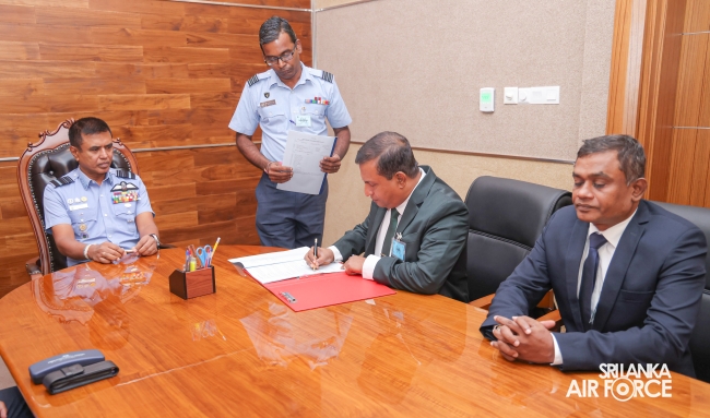 A Memorandum of Understanding (MOU) was signed between the Agriculture and Agrarian Insurance Board at the Air Force Headquarters today (20 May 2024). The occasion was attended in the presence of the Commander of the Air Force, Air Marshal Udeni Rajapaksa and the Chairman of the Agriculture and Agrarian Insurance Board, Prof. WMMB Weerasekara.