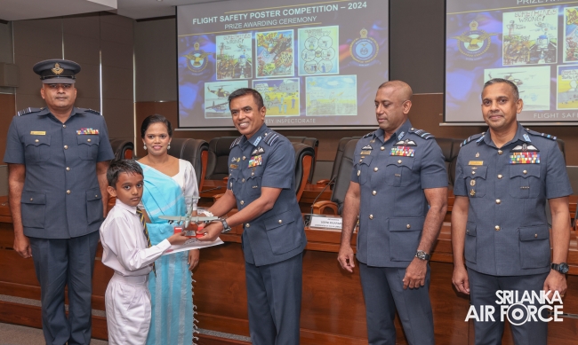 The Flight Safety Inspectorate, under the supervision of Director Flight Safety, Air Commodore Asela Jayasekara, conducted the Flight Safety Poster Competition Awards Ceremony at Air Force Headquarters today (05 June 2024). The event was graced by the Commander of the Air Force, Air Marshal Udeni Rajapaksa, as the Chief Guest, who presented prizes and certificates to the top winners of the competition.