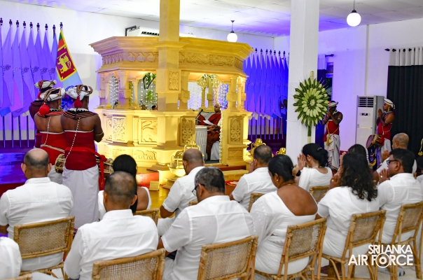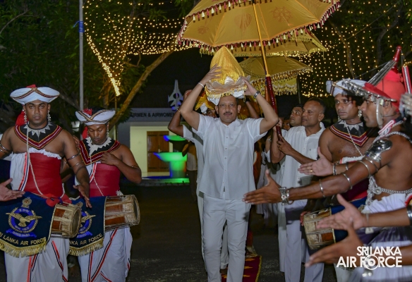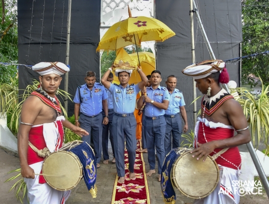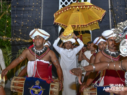 Prior to the commencement of the ceremony, the ‘Reliquary’ (Karaduwa) was brought to Trade Training School’s Airmen Mess in a colourful procession and was placed in the ‘Pirith Mandapaya’ by the Commander of the Air Force, Air Marshal Udeni Rajapaksa.