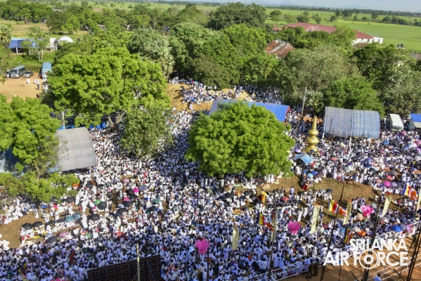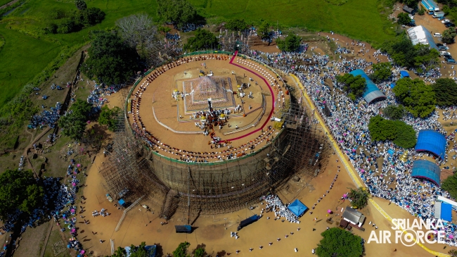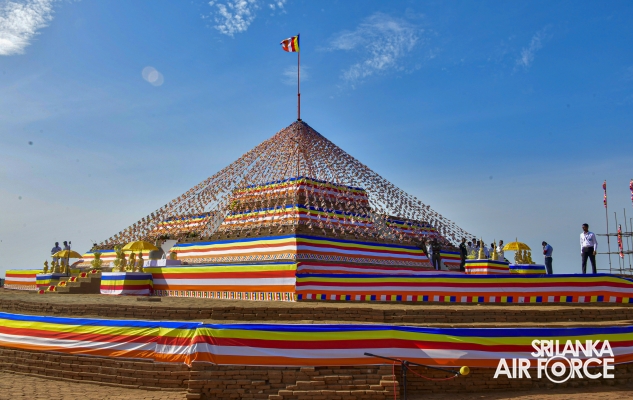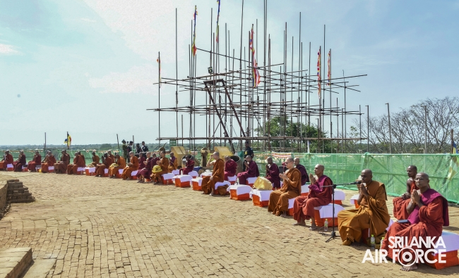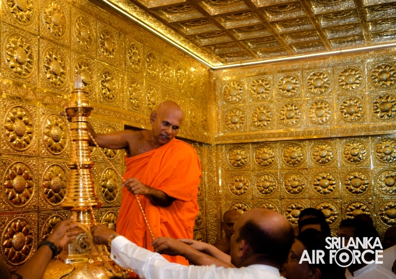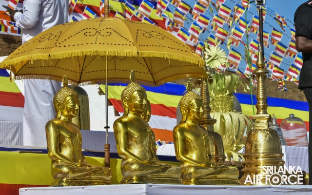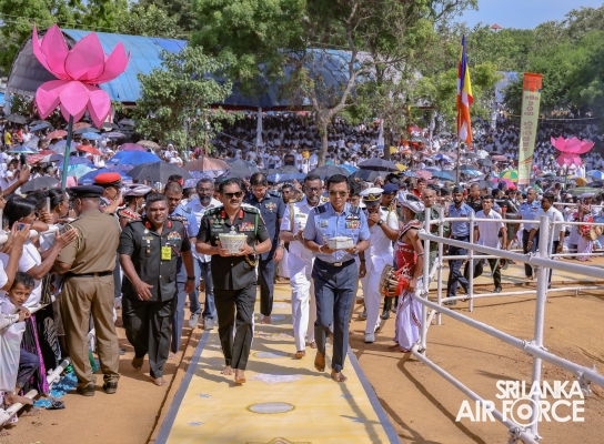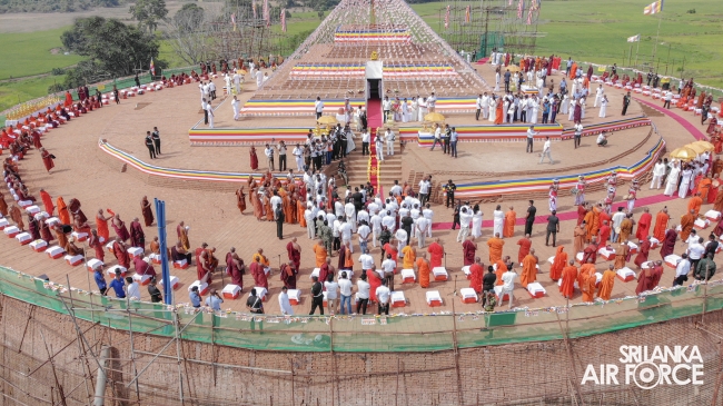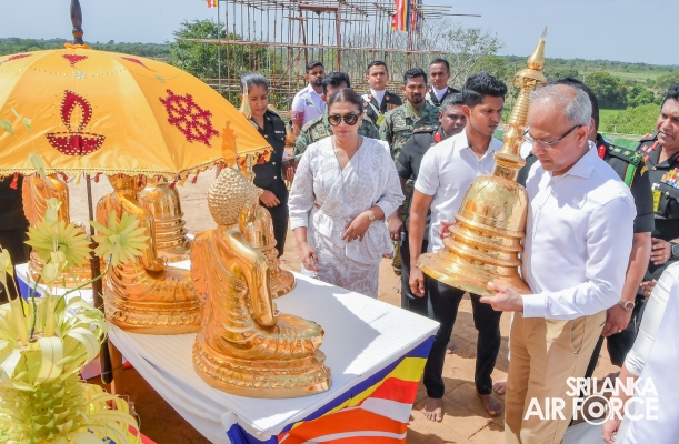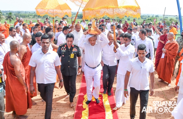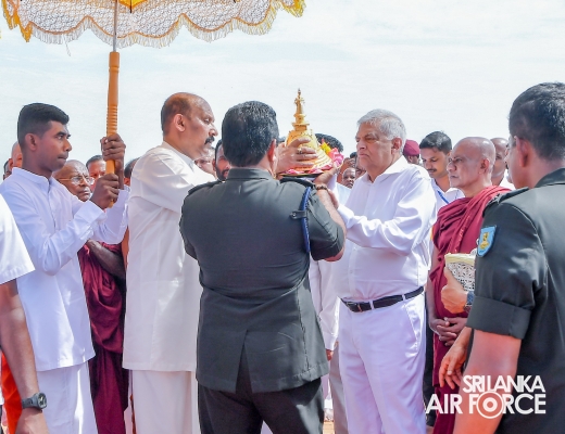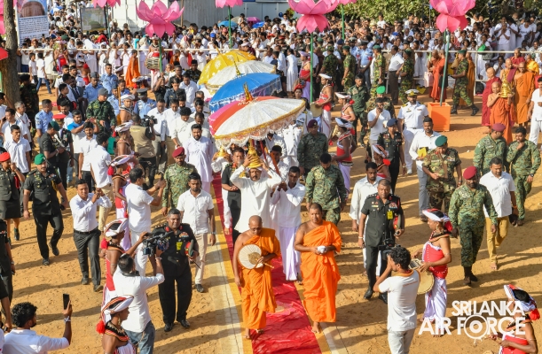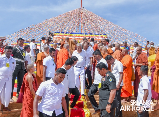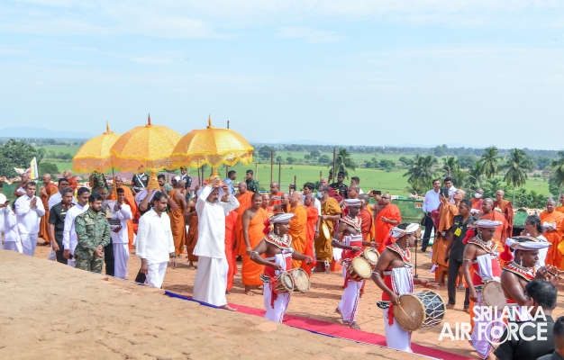 During the ceremony, the President deposited the relics in the Deegawapiya Stupa amidst the chanting of ‘Seth Pirith’ by the Maha Sangha. Concurrently, the SLAF's Bell-212 helicopter showered flowers from the air as floral tributes were offered.