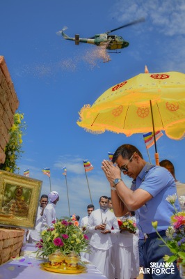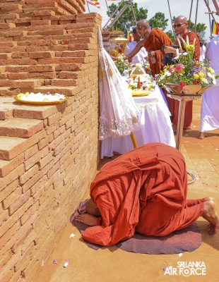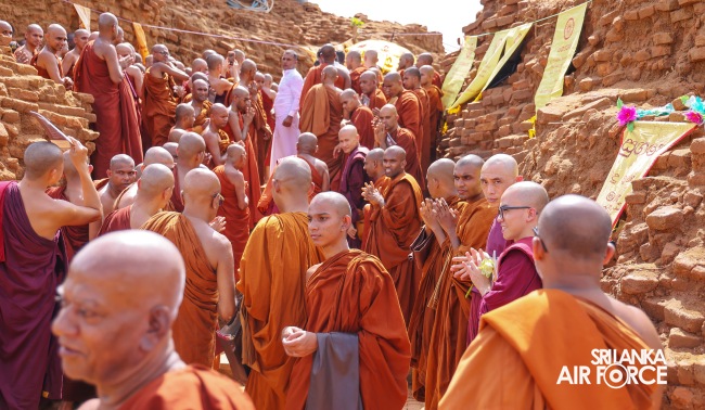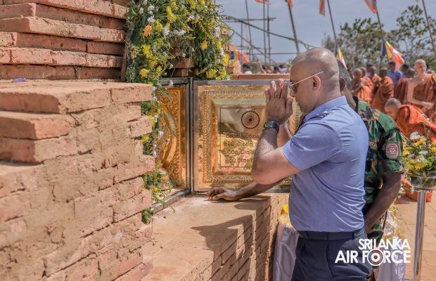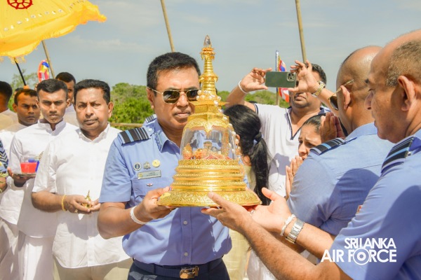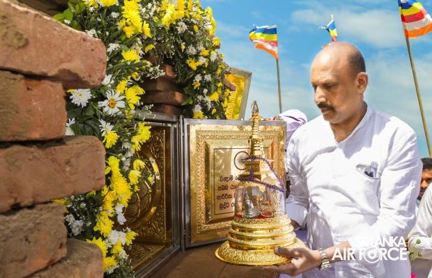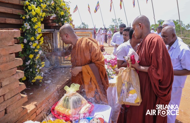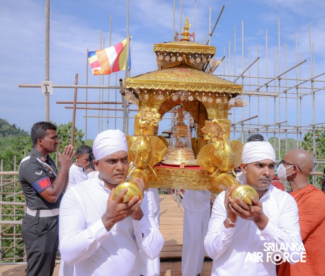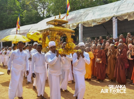 During the ceremony, the Secretary of Defence deposited the relics in the Neelagiri Maha Seya, amidst the chanting of 'Seth Pirith' by the Maha Sangha. Subsequently, a Bell-212 helicopter from the SLAF showered flowers from the air as floral tributes were offered.