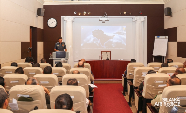 On behalf of the Commandant – National Defence College, the Senior Directing Staff (Army) of the National Defence College, Brigadier Rohan Medagoda received the Commander on his arrival at the College. Thereafter, the Senior Directing Staff (Air Force) of the National Defence College, Air Commodore Amitha Jayamaha made an introductory note for Air Marshal Rajapaksa before handing over proceedings for the Commander’s lecture.