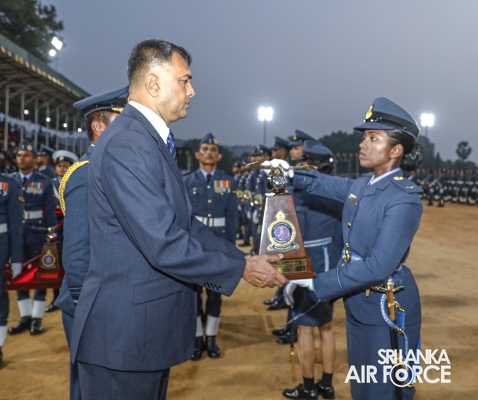 Following the pinning of Flying Brevets, the Chief Guest awarded trophies to officers and lady officers in recognition of their outstanding achievements in their respective training modules. Among these prestigious accolades, the "Sword of Honour" was presented to Pilot Officer JMS Savindi from the No. 67 Officer Cadet Intake and the No. 19 Lady Officer Cadets Intake. This award, presented by Group Captain NR Raheem, is conferred upon the Officer Cadet who has attained the highest results in both academic and professional studies while demonstrating exemplary all-round performance throughout the course across all branches.