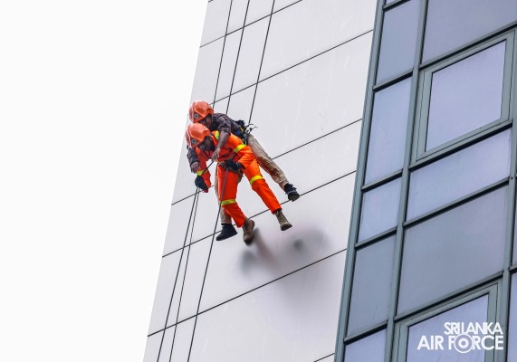 The Sri Lanka Air Force Fire and Rescue Service conducted a comprehensive emergency evacuation drill at Development Holding (PVT), Colombo 2, today (31 January 2025). This was the first time a combined exercise was implemented, incorporating Aerial Ladder Platform Operations, Rope Rescue Operations, Breathing Apparatus Operations, and a High-Rise Building Rescue (HRBR) demonstration, utilizing SLAF air assets.