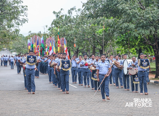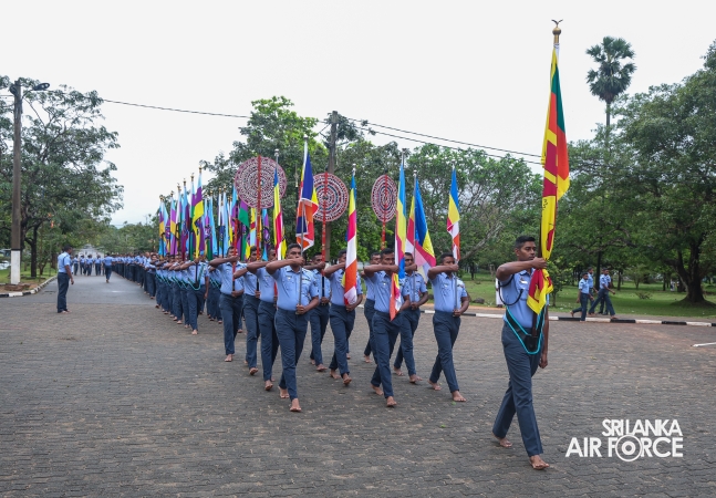 In a ceremonial procession, flag-bearers assembled at the Welimaluwa (lower layer) while being accompanied by a vibrant pageant led by monks, who proceeded to the Udamaluwa for religious observances. Subsequently, all flags representing the Sri Lanka Air Force and its establishments were taken to the upper layer, where a symbolic invocation of blessings took place. This ritual bestows blessings upon all personnel of the Sri Lanka Air Force serving across the entire island in diverse capacities.