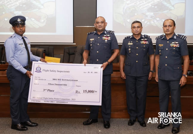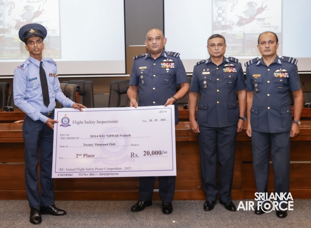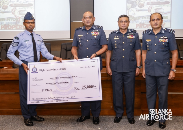 The Inspectorate of Flight Safety under the leadership of the Director Flight Safety conducted the 16th Annual Flight Safety Poster Competition Awards Ceremony at AFHQ this morning (20 May 2025). The Commander of the Air Force, Air Marshal Bandu Edirisinghe graced the event along with the Director General Air Operations, Air Vice Marshal Deshapriya Silva and Director Flight Safety, Air Commodore Amitha Jayamaha.