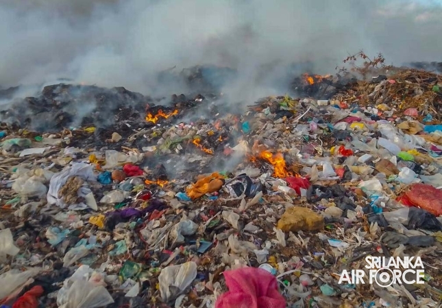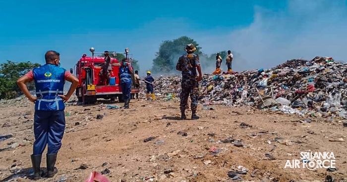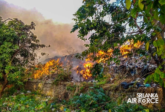 Firefighters from the SLAF Station Palavi, in collaboration with the District Disaster Management Coordinating Unit, the Palavi Municipal Council Fire Brigade, SLNS Thambapanni of the Northwestern Naval Command, and the Sri Lanka Army’s 58th Infantry Division, conducted a joint operation to contain a fire at a garbage dump in the Puttalam area yesterday (05 July 2025).