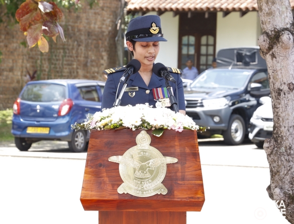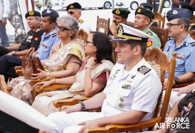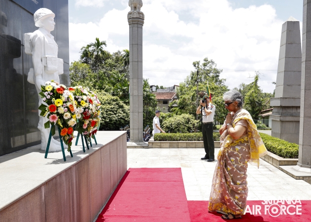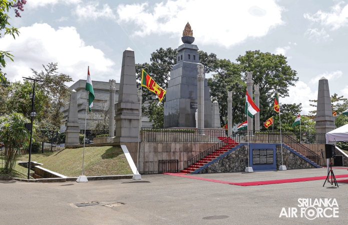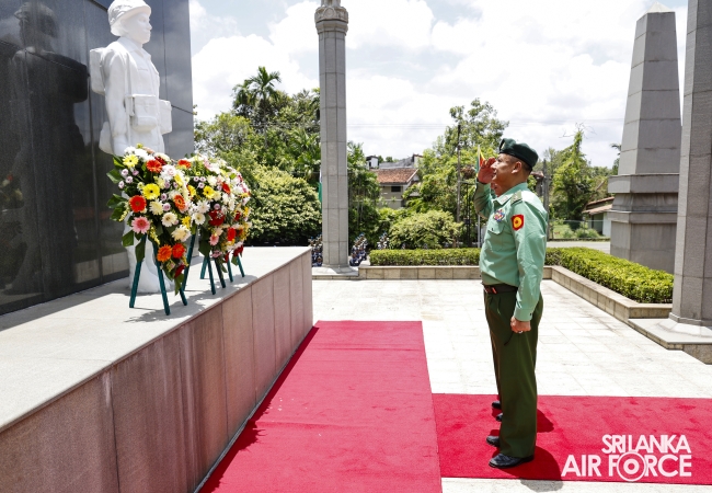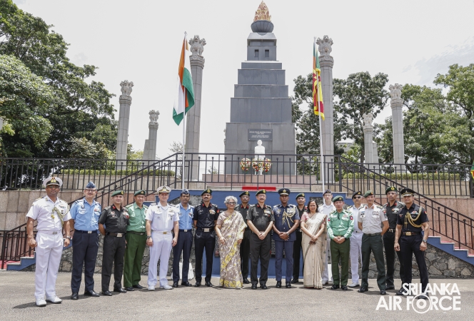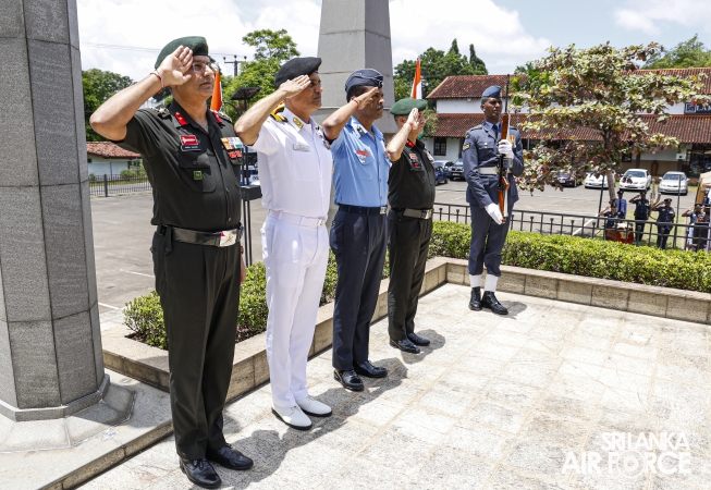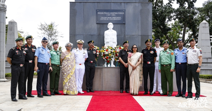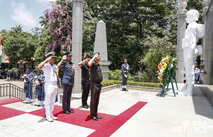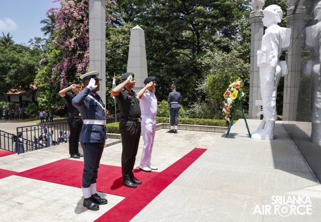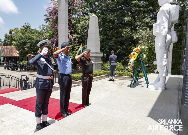 Prior to arriving at Air Force Headquarters, the delegation visited the Indian Peace Keeping Force Memorial at Sri Jayewardenepura Kotte, where they paid floral tribute to the members of the Indian Peace Keeping Force who made the supreme sacrifice in Sri Lanka.