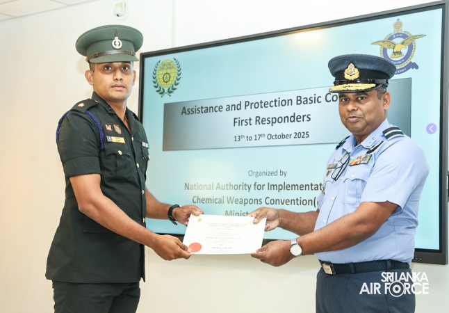 The Assistance and Protection Basic Course, organized by the National Authority for the Implementation of the Chemical Weapons Convention (NACWC) Sri Lanka, was successfully conducted at the No. 49 CBRNE Wing, SLAF Base Katunayake. The programme commenced on 13 October 2025 and concluded successfully yesterday (17 October 2025).