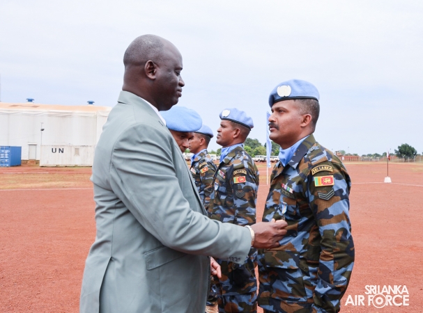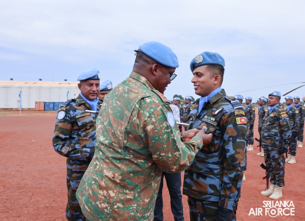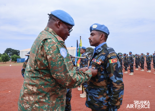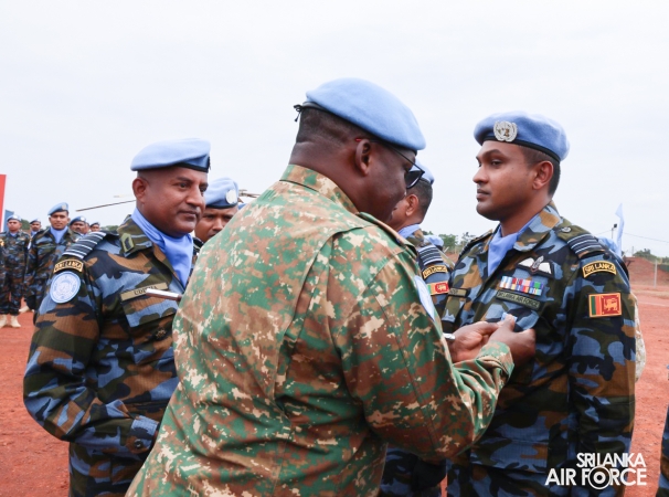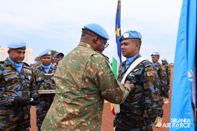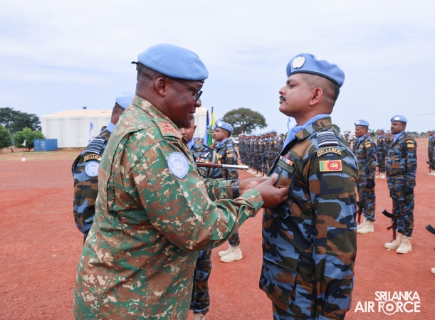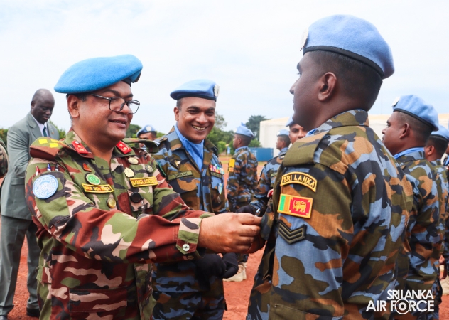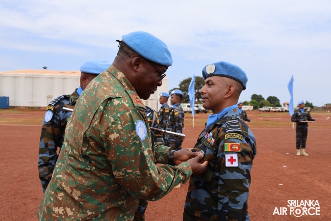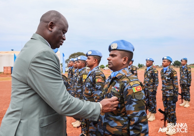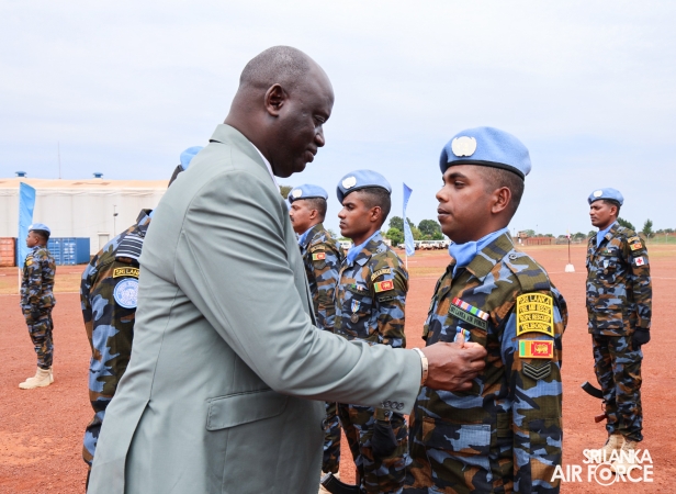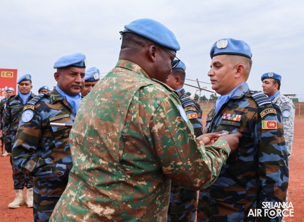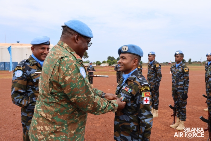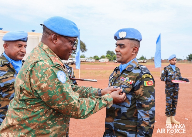 The United Nations Peacekeepers' Medal Awarding Parade of Sri Lanka Air Force 10th Aviation Contingent deployed in Bria, Central African Republic was held glamorously today (22 October 2025). The Force Commander of MINUSCA, Lieutenant General Humphrey Nyone took the salute during the ceremony as the Chief Guest and reviewed the parade.