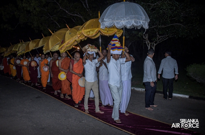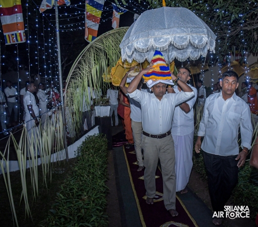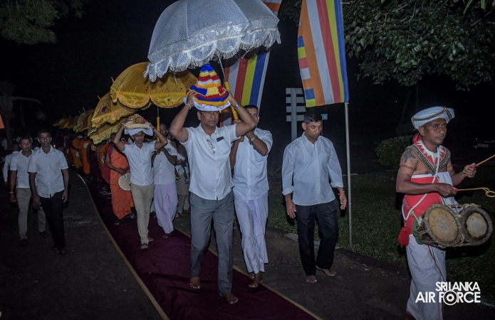 The religious programme commenced with a formal procession, during which the sacred Karaduwa (reliquary) was ceremonially escorted to SLAF Base Vavuniya. Thereafter, the sacred relic was respectfully placed at the beautifully decorated Pirith Mandapaya by the Base Commander. The chanting of Pirith continued throughout the night, creating an atmosphere of serenity, reflection and spiritual enrichment within the Base premises.