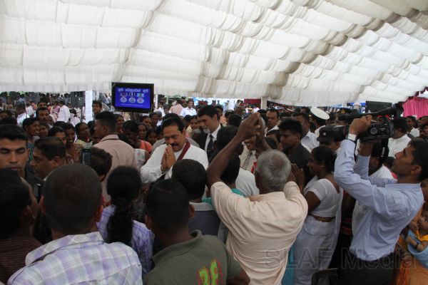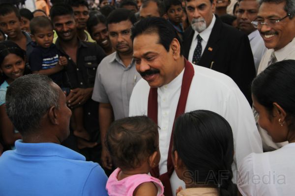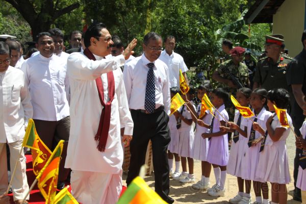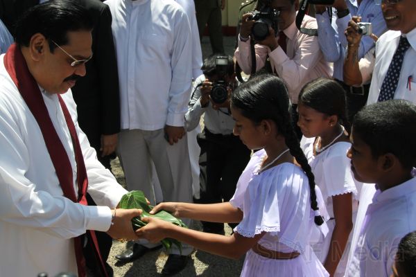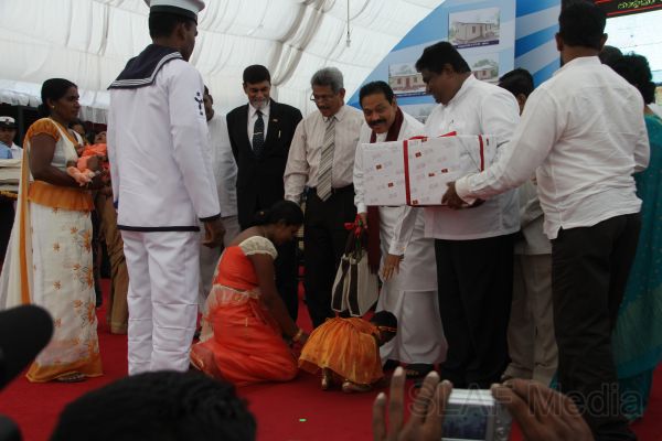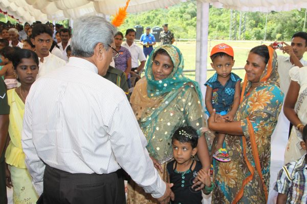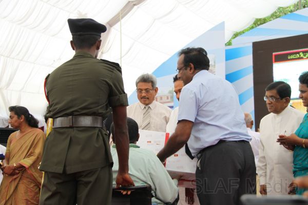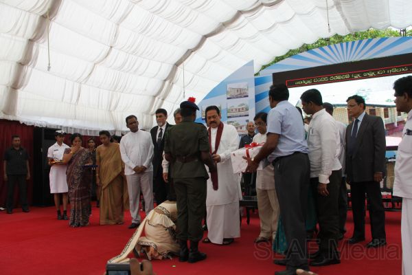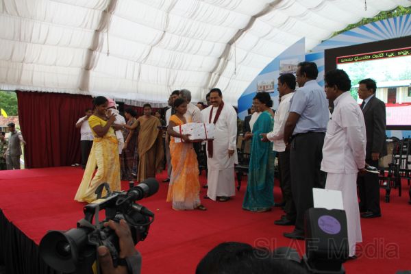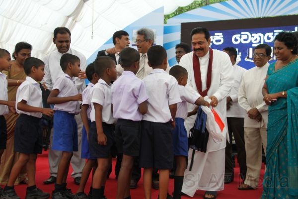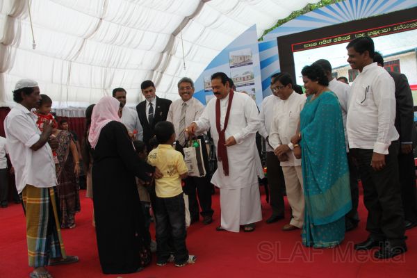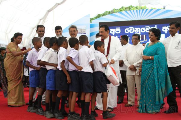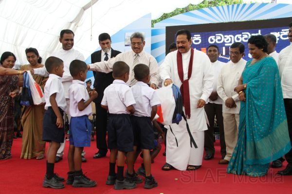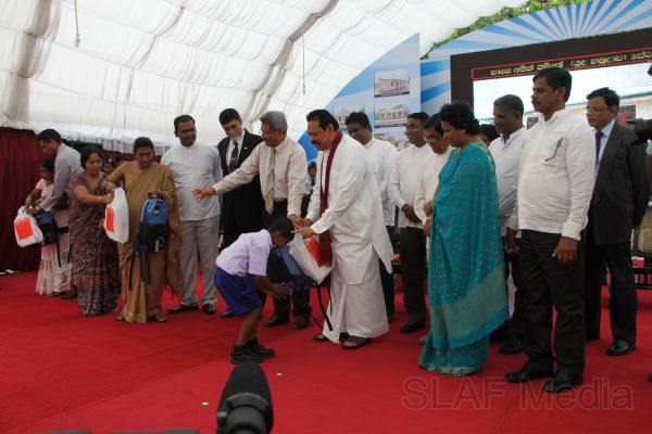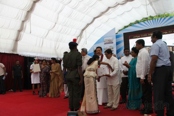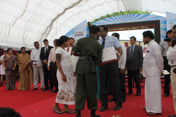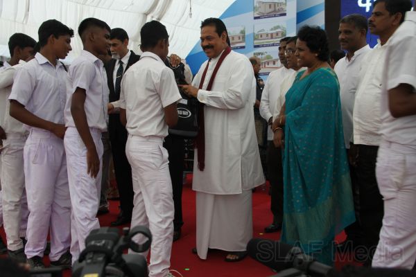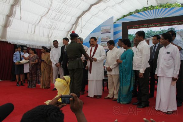 Following this, HE the President Mahinda Rajapaksa presented another thirteen Ranaviru families with the keys to their newly built houses and with household equipment and gifts. Subsequent to this, school children of the Divulana Maha Vidyalaya were given school bags, shoes and required stationery by the President himself.