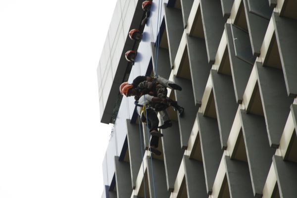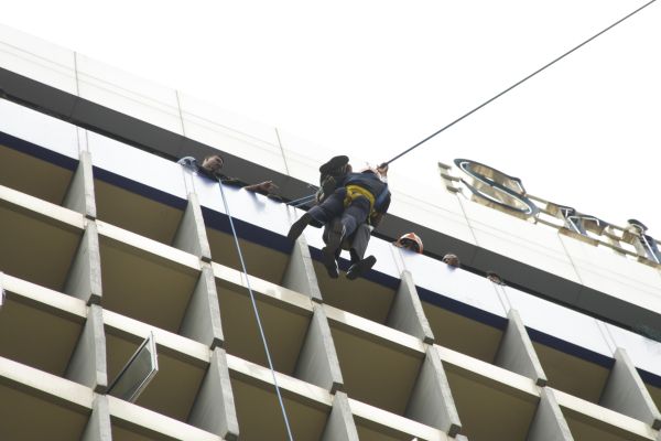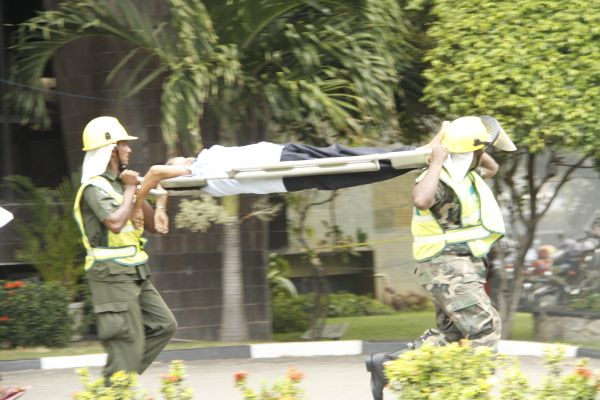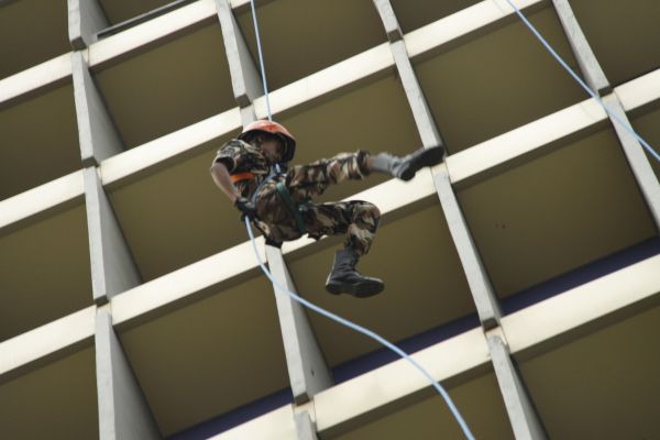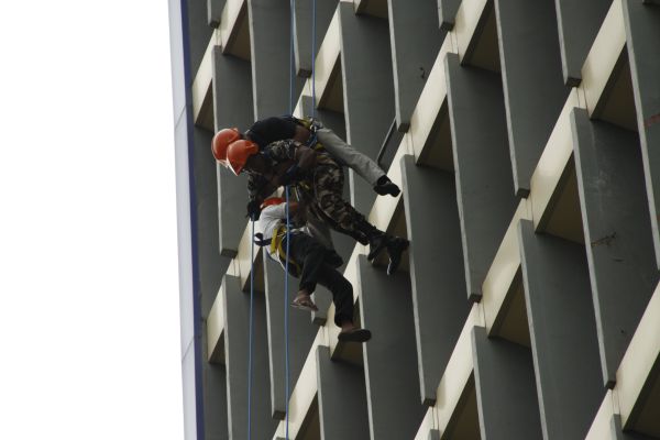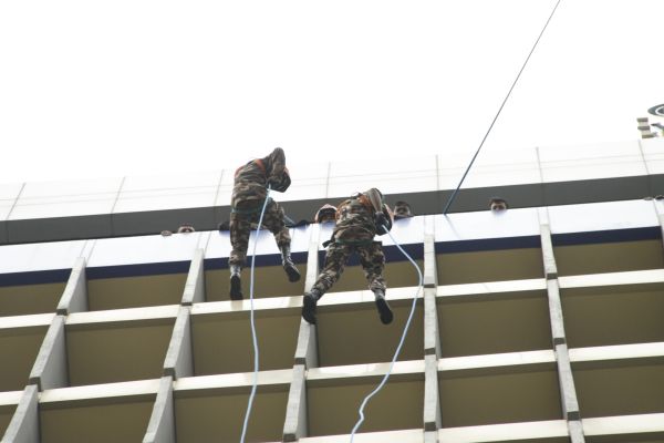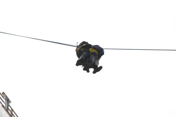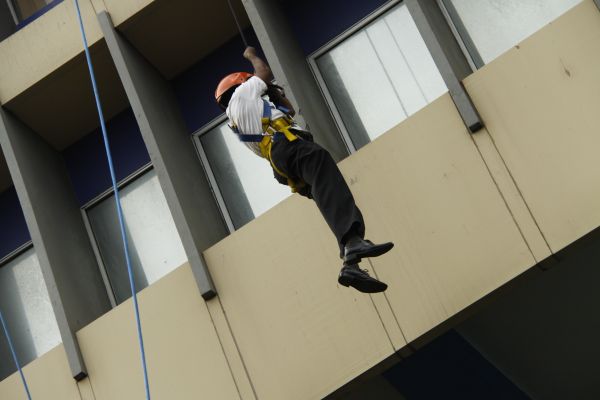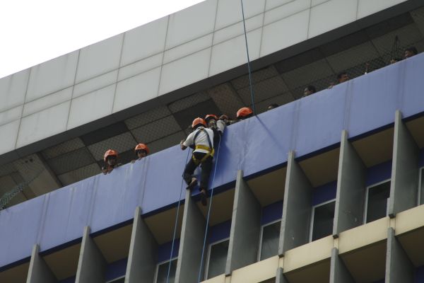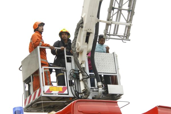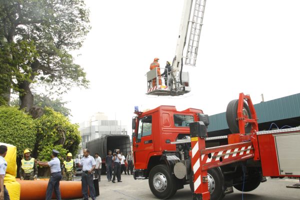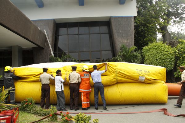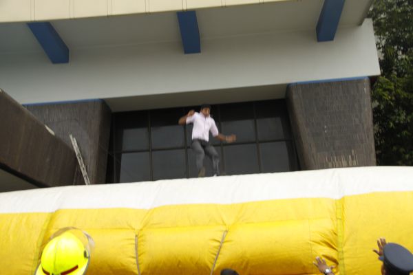 The personnel in the lower floors were afforded a smooth landing by use of the ‘jumping sheet’ (an inflated landing pad) which was placed on the ground. Whilst the Skylift Bronco (Fire vehicle Aerial Ladder system) came into action with its extended arm to reach the top floors to evacuate people, the safety rope rescue system were also used to evacuate personnel (including simulated injured personnel) from the top floors of the building.