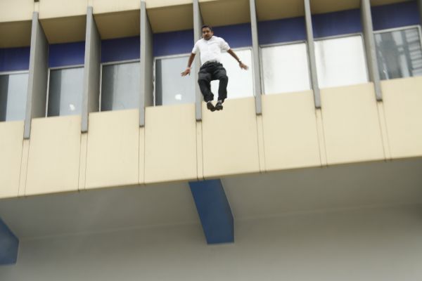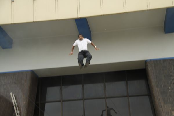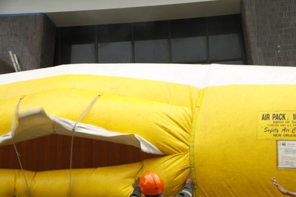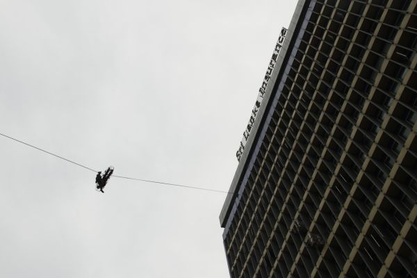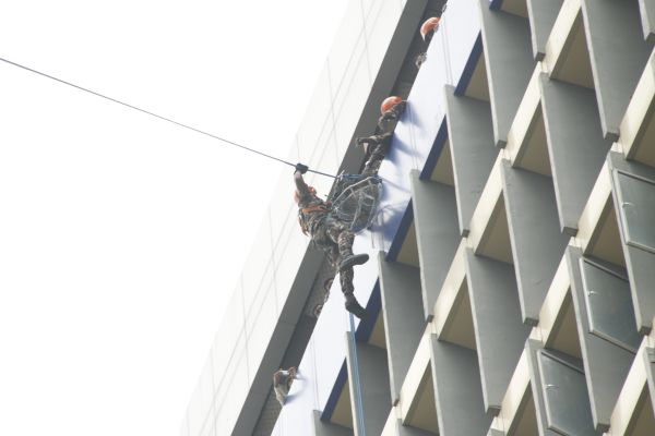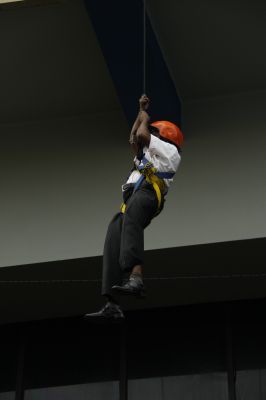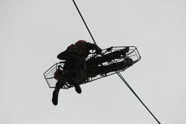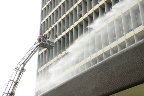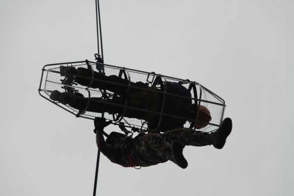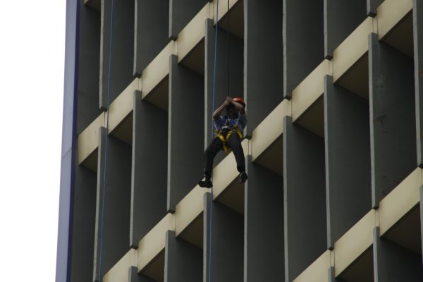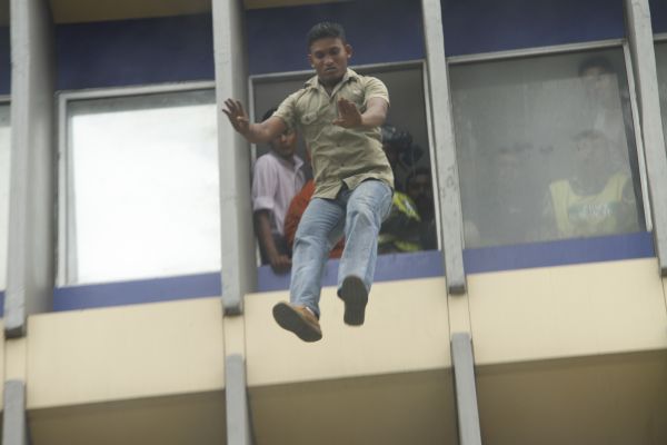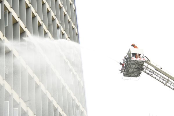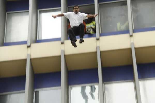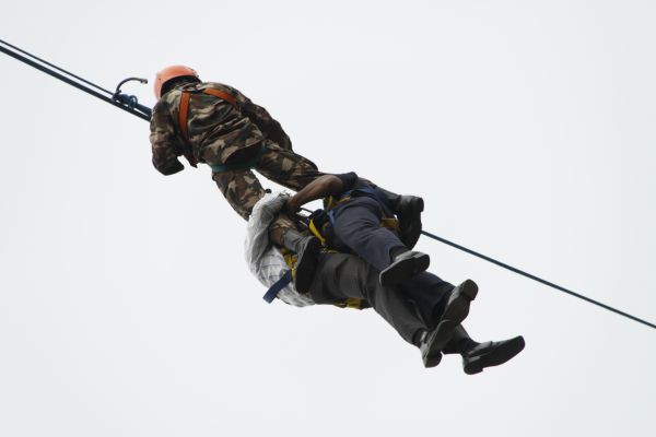 The personnel in the lower floors were afforded a smooth landing by use of the ‘jumping sheet’ (an inflated landing pad) which was placed on the ground. Whilst the Skylift Bronco (Fire vehicle Aerial Ladder system) came into action with its extended arm to reach the top floors to evacuate people, the safety rope rescue system were also used to evacuate personnel (including simulated injured personnel) from the top floors of the building.