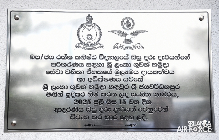 Under the inspiring theme ‘Guwan Mithudam', the Seva Vanitha Unit of the Sri Lanka Air Force proudly inaugurated a newly constructed music room for the students of Rathna Primary School Athurugiriya today (15 July 2025). This initiative represents a harmonious blend of service, support and social responsibility, aimed at enriching the educational experience of young learners.