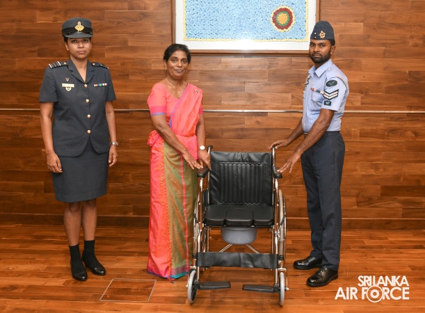 The Chairperson of the SLAF Seva Vanitha Unit, Mrs. Krishanthi Edirisinghe, handed over two (02) commode wheelchairs to deserving family members of service personnel today (19 September 2025) at Air Force Headquarters.