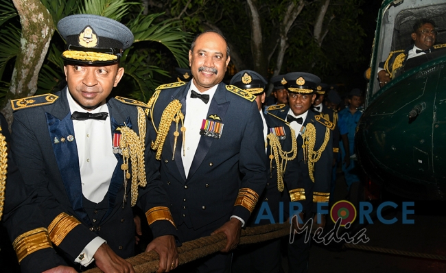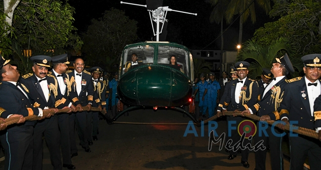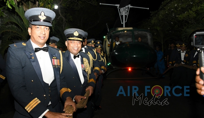 Following this, the customary Dining Out Night was held at the Officers’ Mess at SLAF Base Ratmalana. This event is held to honour the services of Air Chief Marshal Kapila Jayampathy and it is also part of SLAF traditions to ceremonially dine out an outgoing Commander. At the end of the event, the outgoing Commander and his lady Mrs. Anoma Jayampathy were seated in a Bell 212 Helicopter and towed away from the Officers’ Mess symbolizing their departure from the Air Force.