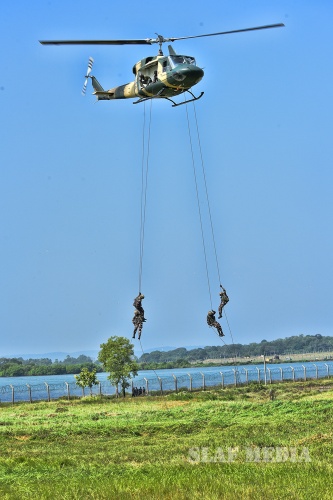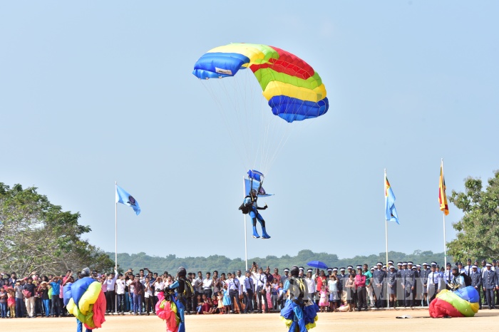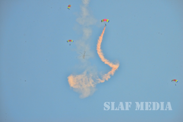 ලකඹර ජයගත් ගුවන් හමුදා පැරෂුට් භටයින් නිල් අහසේ තම අණසක පතුරවමින් නිදහසේ එක් එක් රටා මවමින් පැරෂුට් සංදර්ශනයක් ඉදිරිපත් කල අතර ආධුනික ගුවන් භටයින් විසින් ඔවුන් පුහුණුවන ලද අත්දැකීම් උපයෝගී කර ගනිමින් සතුරු කදවුරු වලට ප්රහාරයක් දියත් කරන ආකාරයේ කි්රයාදාම සංදර්ශනයක් ද ඉදිරිපත් කරන ලදී.