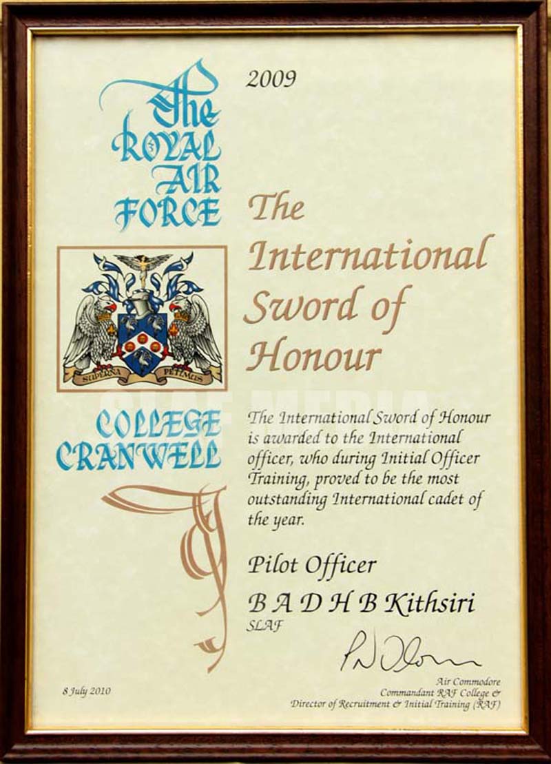 මෙසේ සම්මානයට පාත්ර වූ කෙඩෙට් නිළධාරී කිත්සිරි හට රාජකීය ගුවන් හමුදාවේ මාණ්ඩලික නිළධාරී එයාර් චීෆ් මාර්ෂල් සයිමන් බ්රයන්ට් විසින් පසුගිය ජූලි මස 8 වන දා ගෞරවනීය අසිපතක් ප්රදානය කරන ලදී. මෙම සම්මානය ලැබීමට පෙර වසර පුරා පැවැත්වෙන පාඨමාලා හතරෙන්ම වැඩිම ලකුණු ලබා ගන්නා අන්තර්ජාතික ශිෂ්යයා විය යුතුය. මෙවර කෙඩෙට් නිළධාරී කිත්සිරි විසින් දක්වා ඇති දක්ෂතාවය පසුගිය වසර 12 පුරාවටම ශිෂ්යයෙකු විසින් දක්වා ඇති හොඳම දක්ෂතාවය වේ.