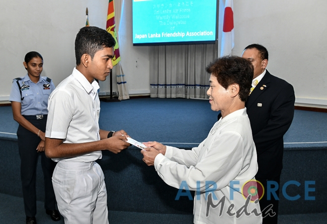 වැඩසටහන ආරම්භ කරමින් ගුවන් හමුදා සේවා පුද්ගලයින්ගේ උසස් පෙළ හදාරන සිසු දරුදැරියන් තිදෙනෙකු හට ශිෂ්යත්ව ප්රදානය කිරීම සිදු කරන ලදී. එහිදී වකිටා ෆුමියෝ මහත්මිය විසින් පළමු ශිෂ්යත්ව ද්විත්වය ජනිත් චානුක හේෂාන් සහ පවනි මදූෂා යන දරු දැරියන් හට ප්රදානය කරන ලද අතර වකිදා අකිකෝ මහත්මිය, තවාඩා හිරෝකෝ මහත්මිය සහ කොමාසේ නොරිකෝ මහත්මිය විසින් තුන්වන ශිස්යත්වය ලක්ෂානි විජේසිංහ හිෂ්යාව හට ප්රදානය කරන ලදී. වකාටා ෆුමියෝ මහත්මිය විසින් ඇස් කණ්නාඩි 200 ක් සහ පැන්සල් පෙට්ටි තොගයක් ගුවන් හමුදා සේවා වනිතා එකකය වෙත ප්රදානය කිරීමද මෙහිදී සිදු කරන ලදී. එම භාණ්ඩ සේවා වනිතා ඒකකයේ ලේකම් ස්කොඩ්රන් ලීඩර් පියුමි ජයසුන්දර විසින් භාරගන්නා ලදී.