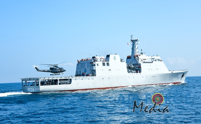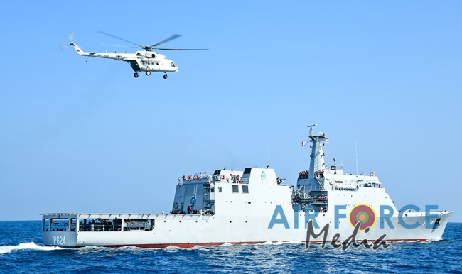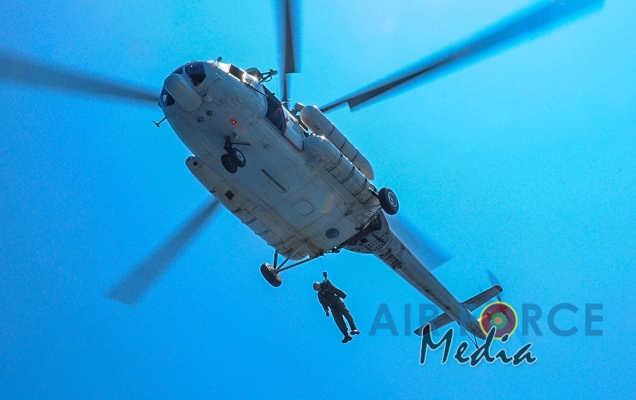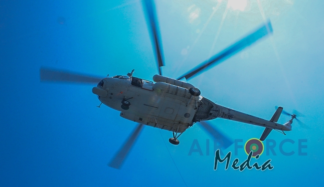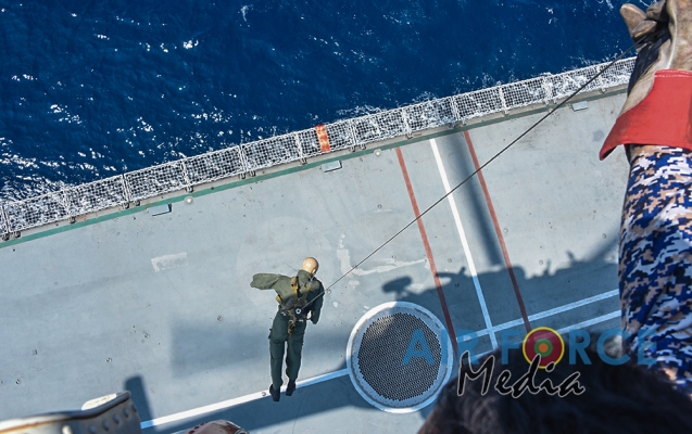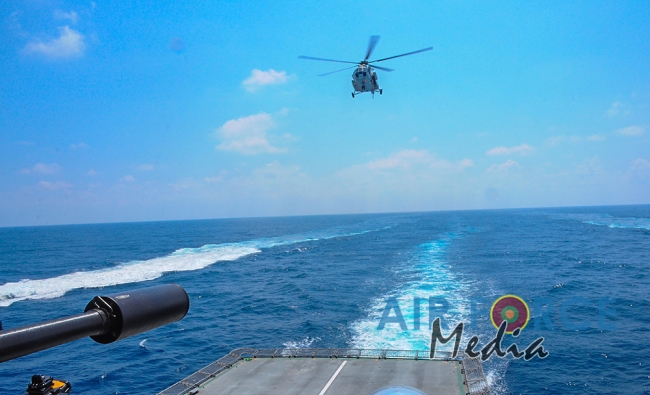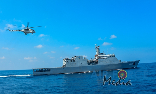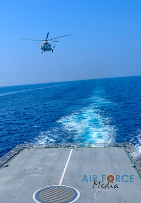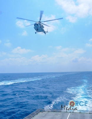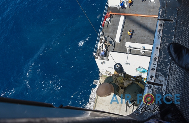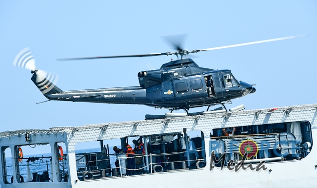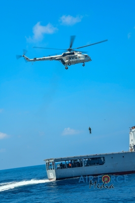 මුහුද මැද සිදුවන අනතුරු වලදී පුද්ගලයින් බෙිරාගැනීමට අවශ්ය පුහුණුව ලාබාදිමෙි අරමුණින් එමි අයි 17 වර්ගයේ හෙලිකොප්ටර් යානයක් භාවිතා කොට නැව මතට කිලෝ 65 ක් බර මිනිස් අනුරුවක් හෙලිකොප්ටර් යානයේ සිට ගොඩ බැස්සවීමය සිදුකරන ලදි. ඒ සඳහා මනා පුහුණුවකින් හෙබිකාර්ය මණ්ඩලයකින් සැදුමි ලත් කණ්ඩායමක් මෙම අභ්යාසයේ නිරතවිය.
