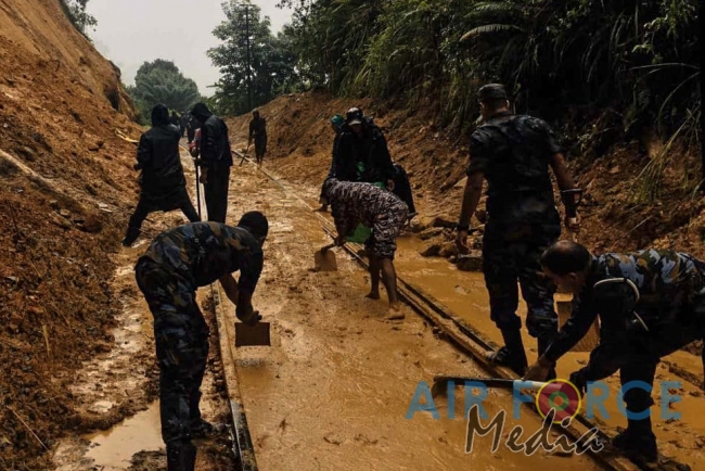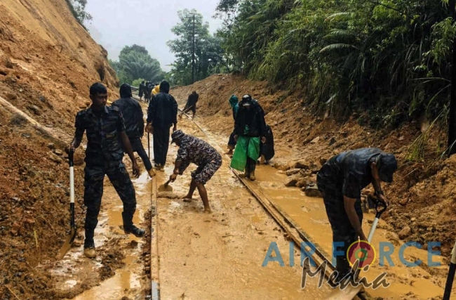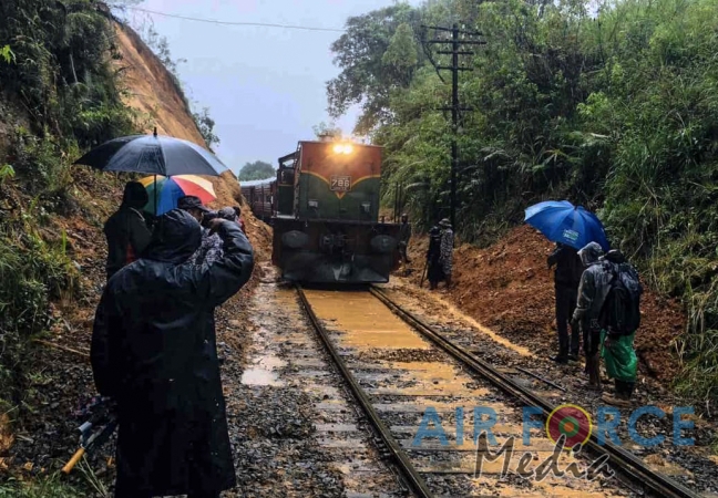 ගුවන් හමුදා ගොඩබිම් සටන් පුහුණු පාසලේ භටයින් විසින් නායයාම නිසා වැසුණු දුම්රිය මාර්ගය පිලිසකර කරයි