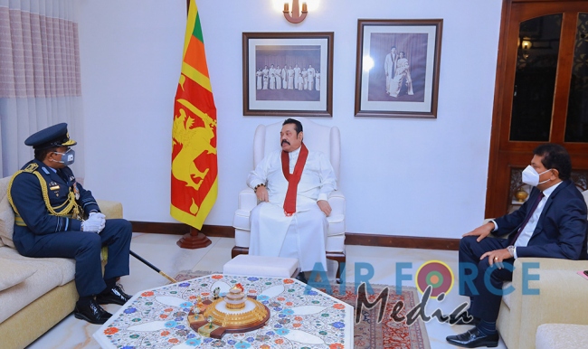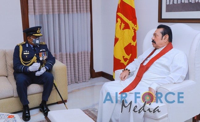 ගුවන් හමුදාධිපති එයාර් මාර්ෂල් සුදර්ශන පතිරන මහතා 2020 නොවැම්බර් මස 09 වන දින අරලියගහ මන්දිරයේදී ගරු අග්රාමාත්ය මහින්ද රාජපක්ෂ මහතා හමුවිය.