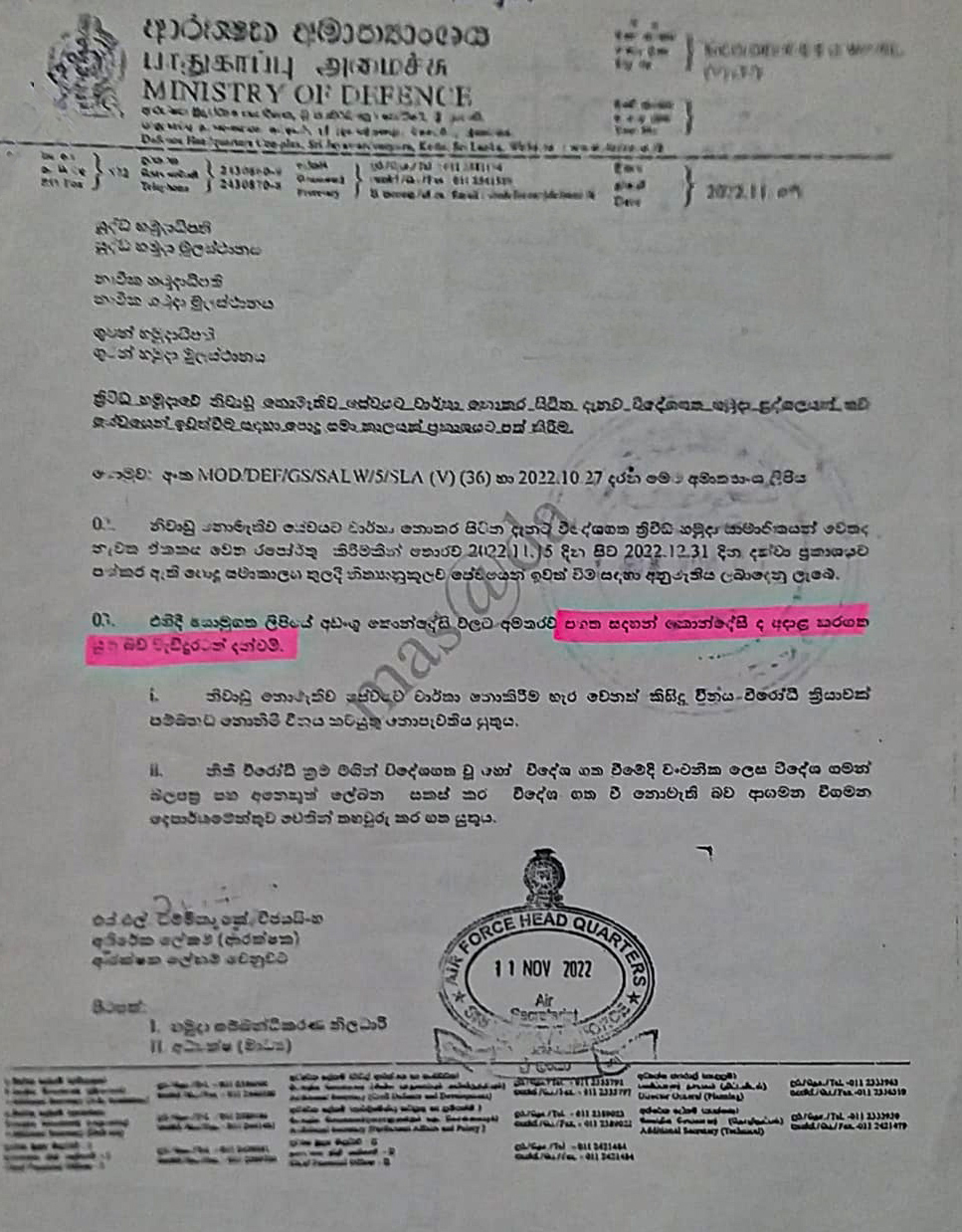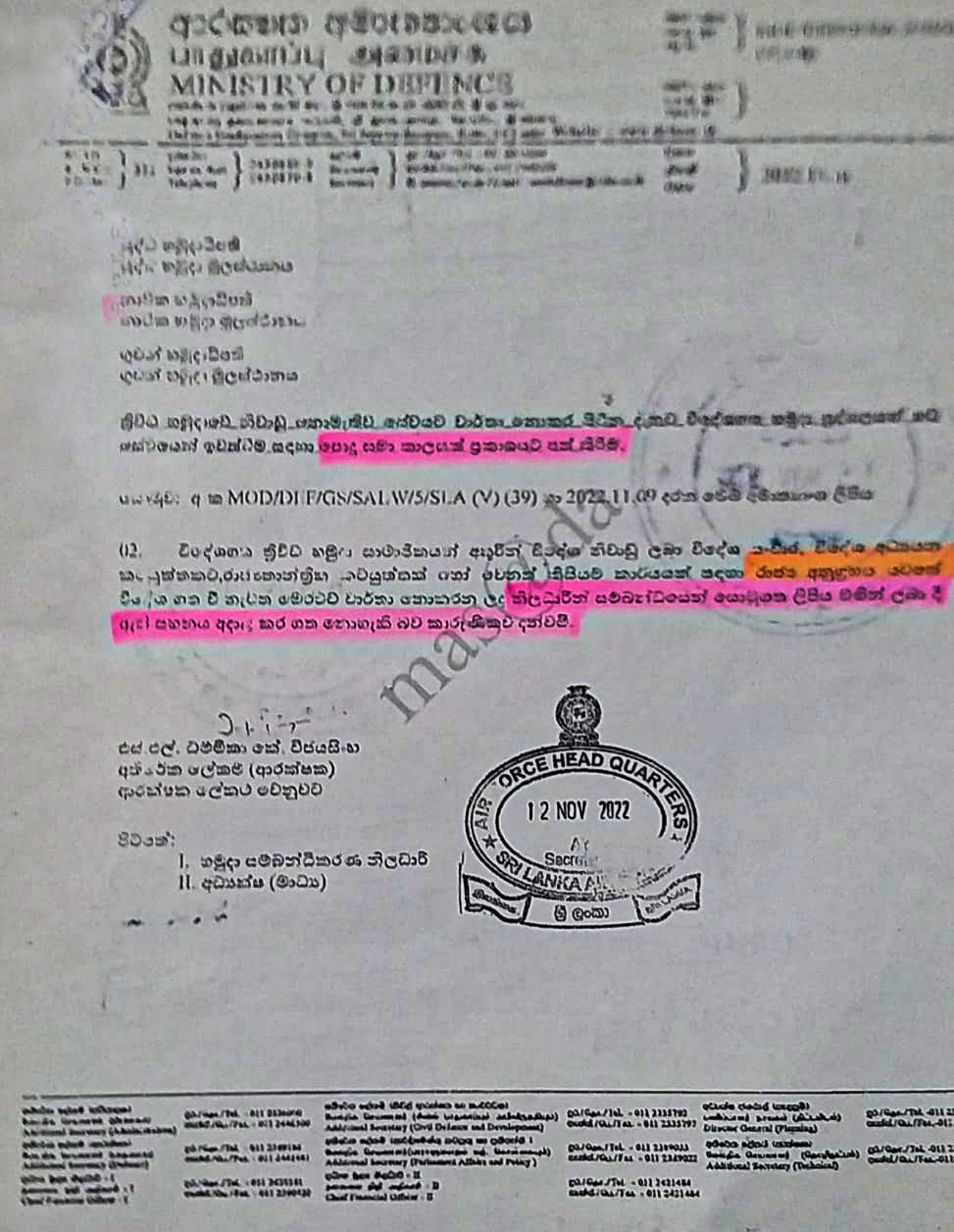 2022 ඔක්තෝබර් 25 වන දින හෝ ඊට පෙර නිල නිවාඩු නොමැතිව නොපැමිණි ගුවන් හමුදා සාමාජිකයින්ට නිසි පරිදි අයකර ගැනීමෙන් පසු ගුවන් හමුදාවෙන් නීත්යානුකූලව ඉවත්ව යාමට හැකිය.මීට අමතරව, විදේශගතව සිටින නොපැමිණෙන අය නිල නිවාඩු නොමැතිව නොපැමිණීම හැර වෙනත් කිසිදු නීතිමය නඩු විභාගයකට යටත් නොවිය යුතුය. එපමණක් නොව, මෙම පුද්ගලයින් නීතිවිරෝධී මාර්ගවලින් විදේශගත වී නොමැති බවට හෝ විදේශ ගමන් බලපත්ර සහ වෙනත් ලියකියවිලි වංචනික ලෙස සකස් කර නොමැති බවට ආගමන හා විගමන දෙපාර්තමේන්තුව සහතික කළ යුතුය.